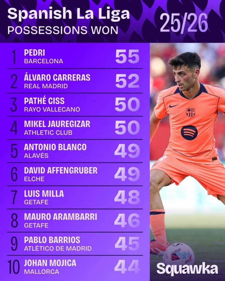 10月7日讯 日前,Squawka统计了本赛季西甲夺回球权次数排名,佩德里55次居首,卡雷拉斯52挨次二。