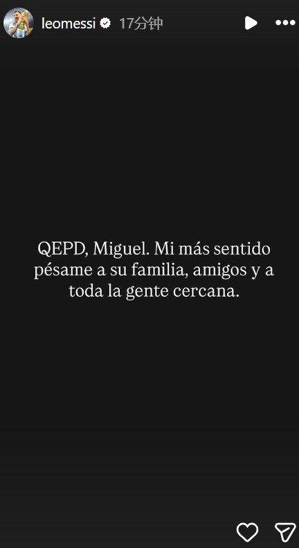在派遣媒体上,阿根廷巨星梅西抒发了怀念之情,他写说念:安息吧,米格尔!我要向他的家东说念主、一又友以及系数亲近的东说念主致以最深刻的怀念!