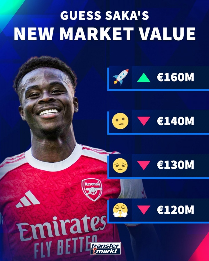 德转给出了萨卡身价变动的四个可能选项,分辩是1.6亿欧、1.4亿欧、1.3亿欧和1.2亿欧。现在24岁的萨卡德回身价为1.5亿欧元,这也意味着本次萨卡的身价一定会迎来变化。