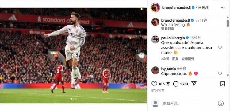 10月20日讯 本轮英超焦点战,曼联2-1客告成物浦。赛后,曼联队长B费更新社媒庆祝告成。