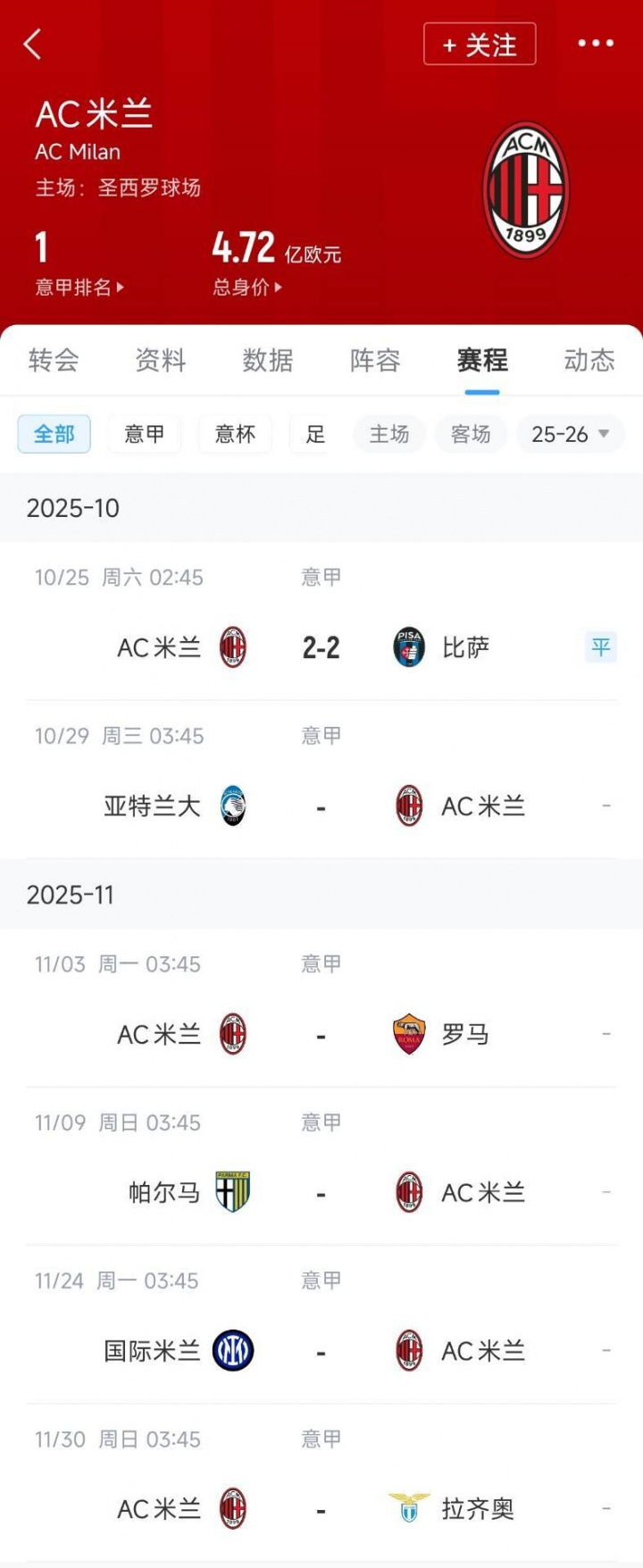 10月25日讯 意甲第8轮,AC米兰2-2战平左迁区的比萨,近3轮比赛1胜2平:0-0尤文、2-1佛罗伦萨、2-2比萨。